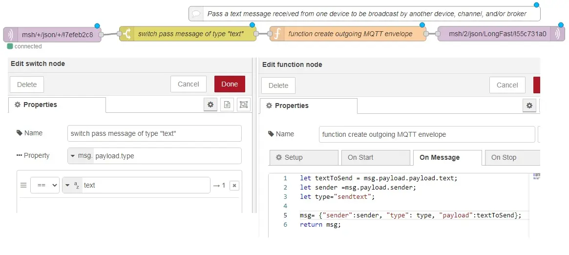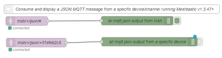 Drag, drop, and wire the nodes like this. For this example, I ran Node-RED on a Windows machine. Note that file paths might be specified differently on different platforms. MQTT server wild cards are usually the same. A "+" is a single level wildcard for a specific topic level. A "#" is a multiple level wildcard that can be used at the end of a topic filter. The debug messages shown are what happens when the inject button sends a JSON message with a topic designed to be picked up by the specified Meshtastic device and then having it rebroadcast the message.
