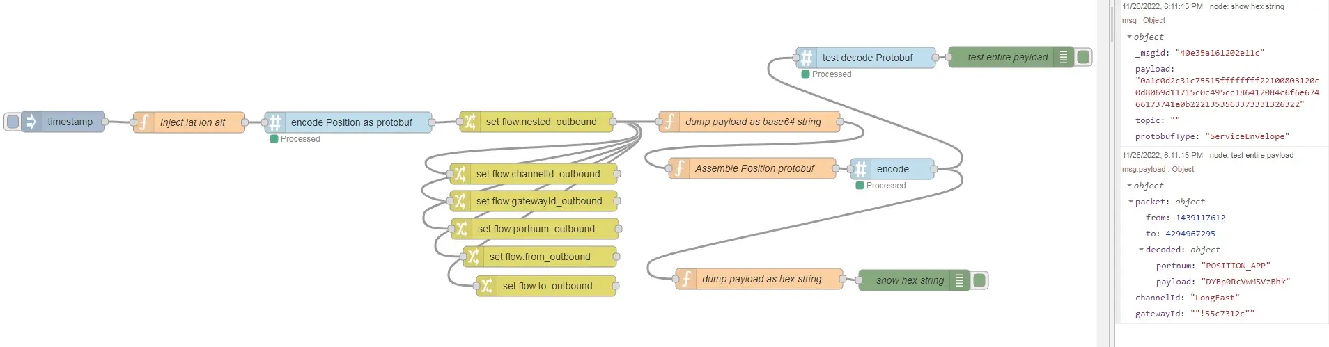 "func": "msg.protobufType=null;\nmsg.payload =\n{\n \"packet\": {\n \"from\": flow.get(\"from_outbound\"),\n \"to\": flow.get(\"to_outbound\"), \n \"decoded\":{\n //how ENUMS are handled here\n //portnum is decoded as string but encoded as number\n //in the encode/decode node-red nodes based on protobuf.js\n \"portnum\": flow.get(\"portnum_outbound\"),\n \"payload\": msg.payload \n } \n },\n\n \"channelId\": flow.get(\"channelId_outbound\"),\n \"gatewayId\": flow.get(\"gatewayId_outbound\"),\n};\nreturn msg;\n//info on how to get json data into protobuf \"bytes\" field\n//https://github.com/protobufjs/protobuf.js/wiki/Changes-in-ProtoBuf.js-3.8",