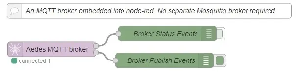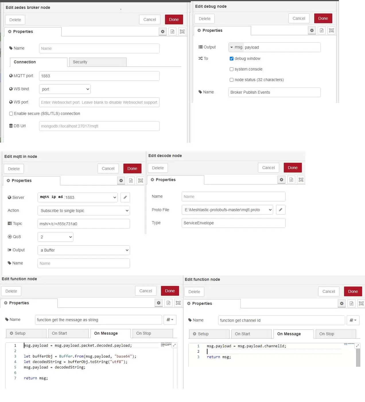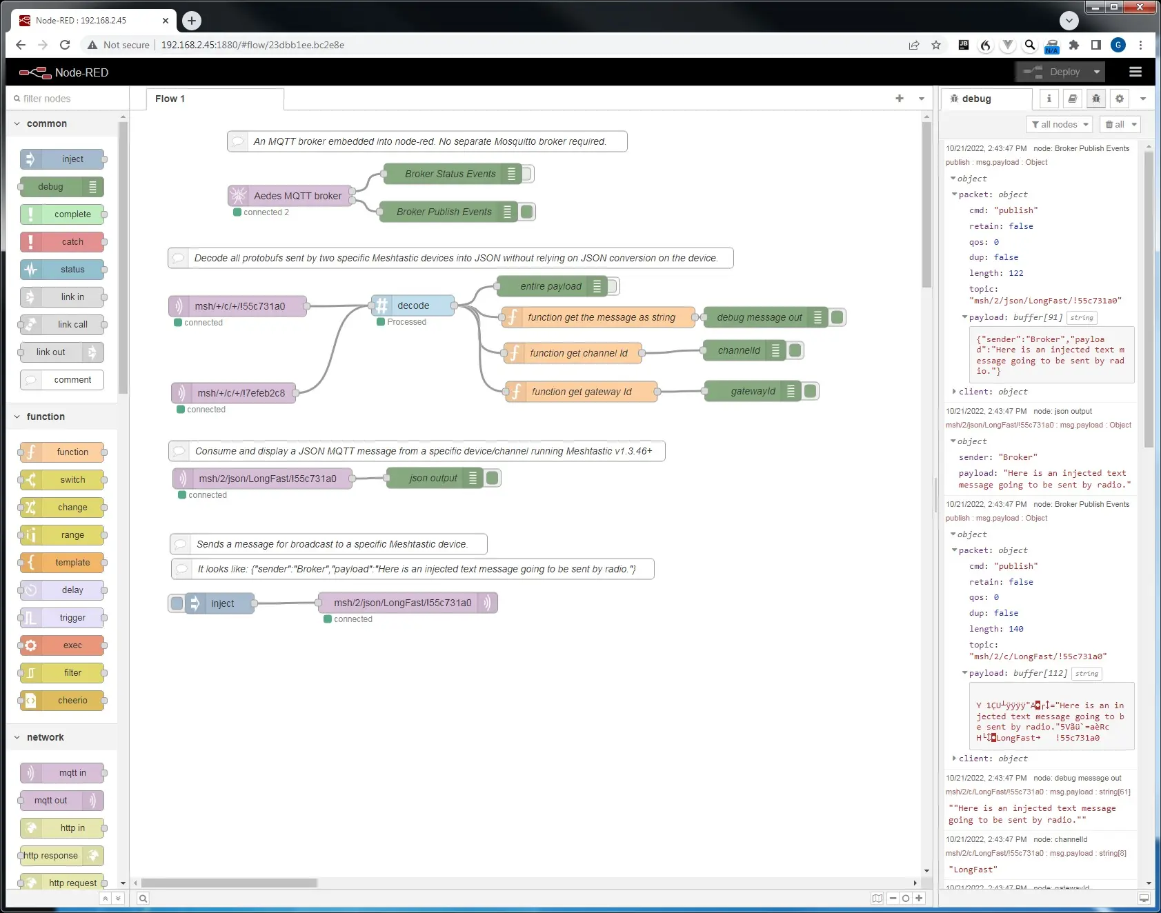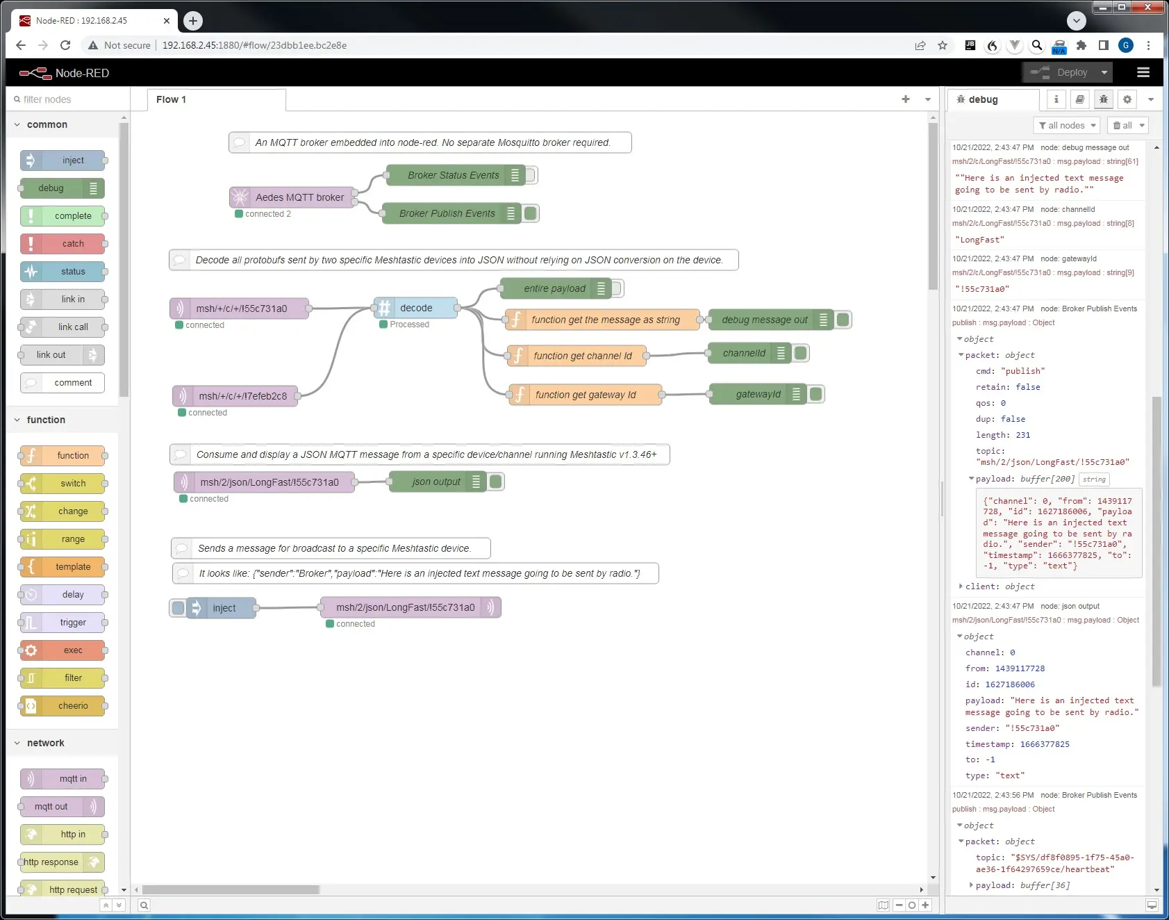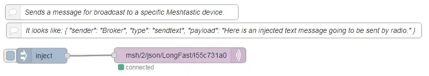 The aedes broker must be set up on the same flow as the other nodes. By activating the Publish debug node, you can see all the published messages. Receiving a json mqtt message is very simple. Injecting a json message to be sent by a device is also very simple. You do need the correct envelope. Forwarding a text message from one device, through a broker, to another broker/device/channel would look like this. If you want to decode text and position messages without json, it gets complicated: If you are interested in my flow for this it is here: